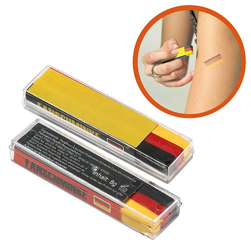 Fanschminke im Deutschland Design. Leiche Handhabung: Ansetzen, Strich ziehen und die Deutschlandfahne ist perfekt. Von der Haut leicht abwaschbar. Alle Preise zzgl. Kosten für die Werbeanbringung. Bei erwünschter Werbeanbringung auf dem bestellten Produkt, bitte einen Kommentar am Ende der Bestellung (Bestellschritt 5) abgeben. Wir setzen uns dann so schnell wie möglich mit Ihnen in Verbindung. Abnahme auch in geringeren Mengen möglich. Preise und Rabatte nach Absprache. |